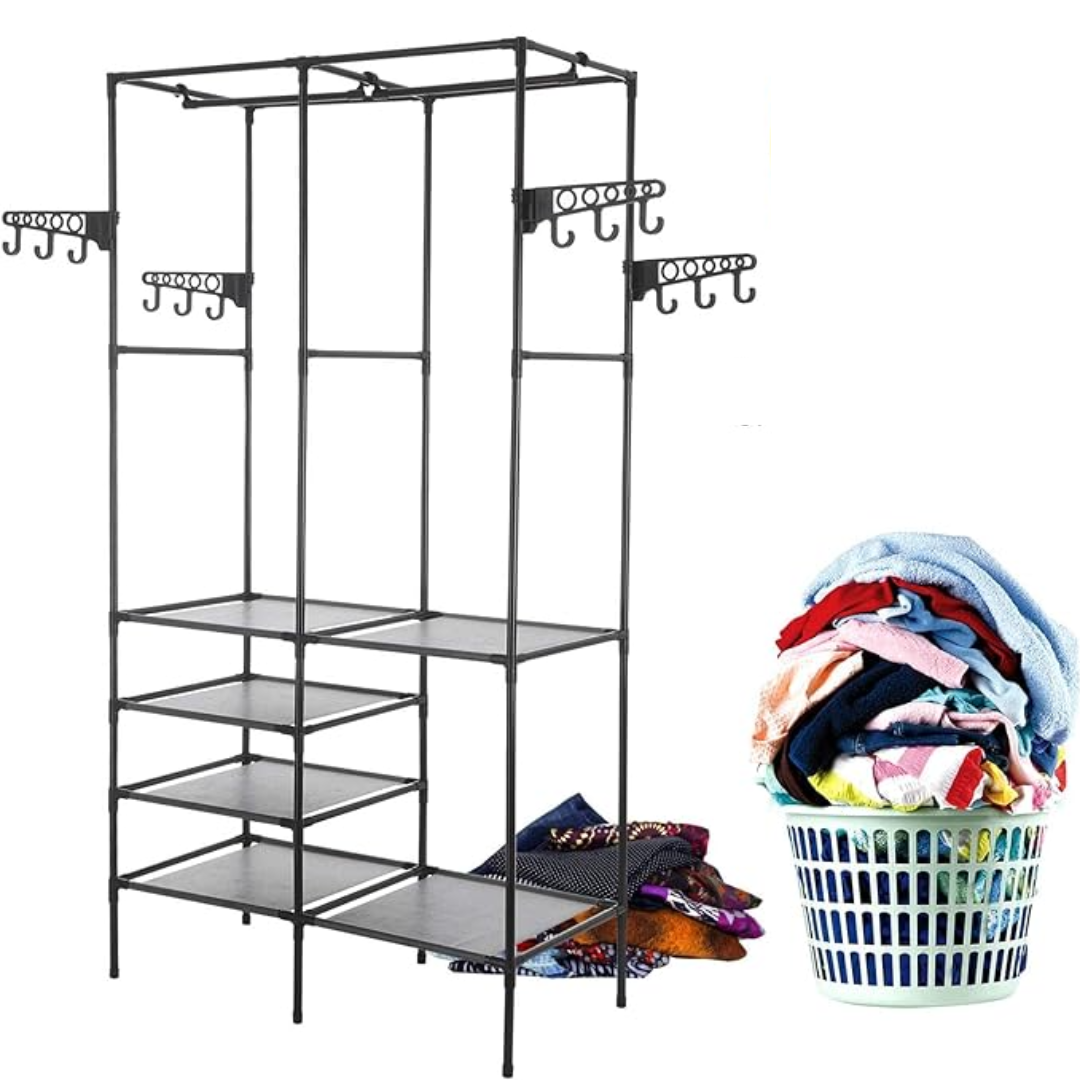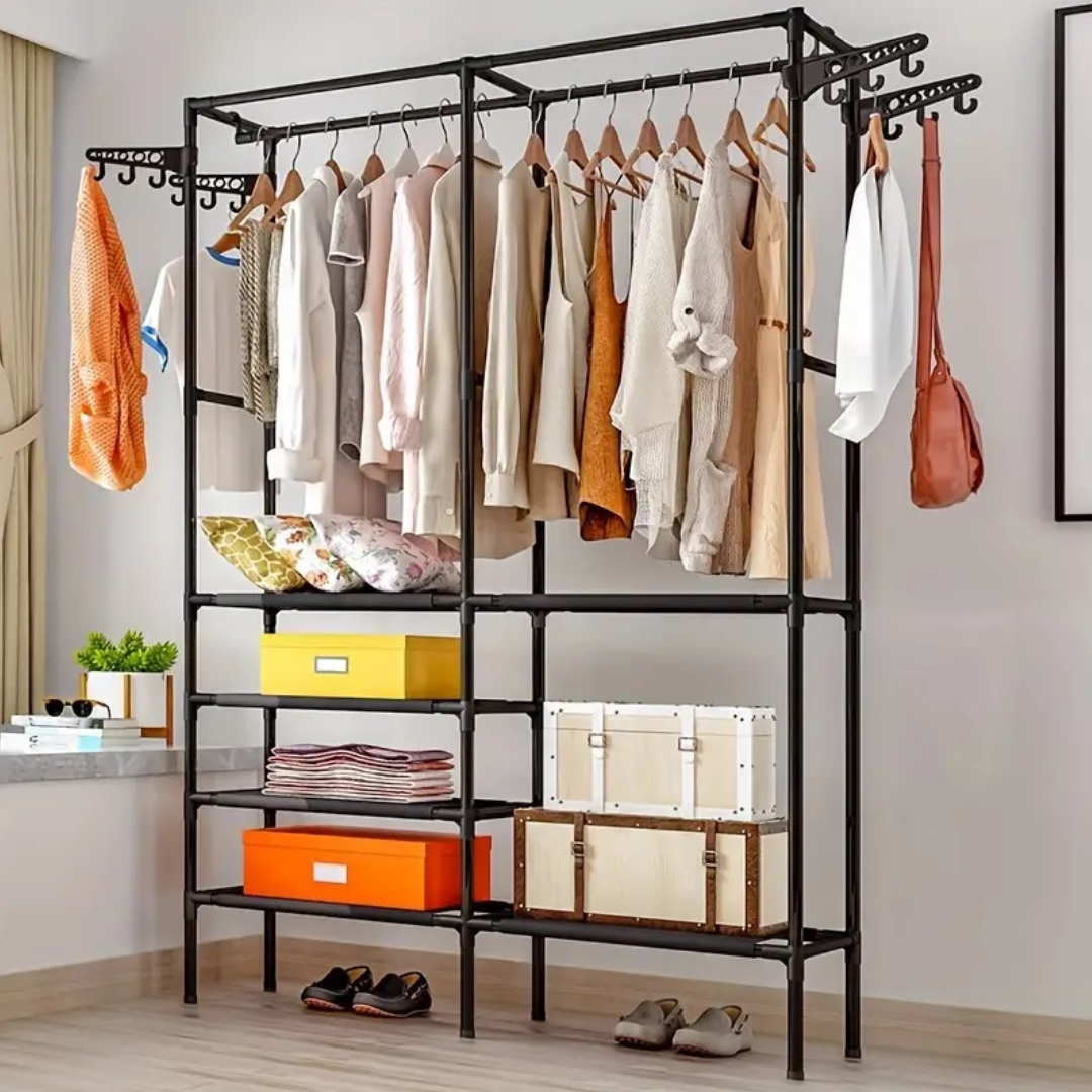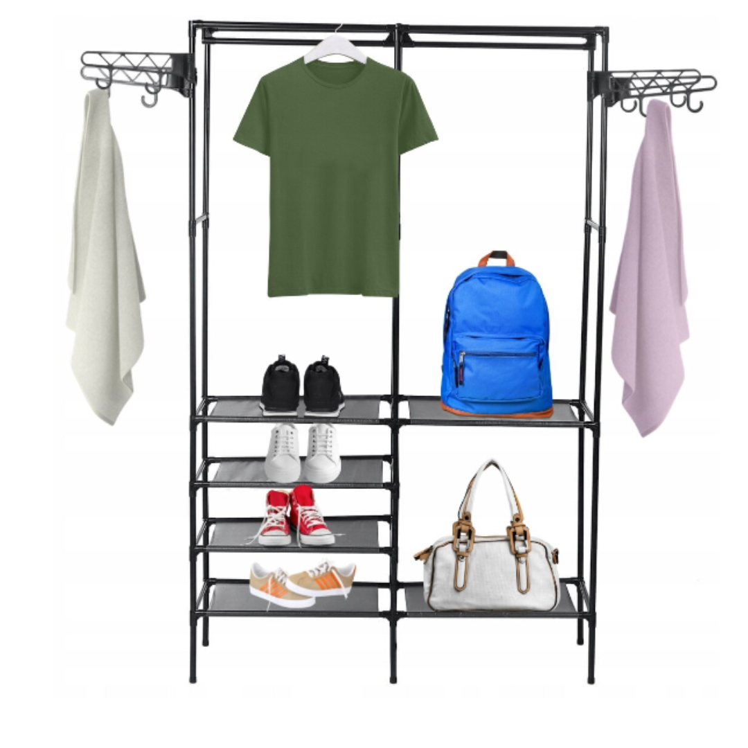 Suportul organizator pentru haine și pantofi cu agățători laterale este soluția perfectă pentru o locuință ordonată, practică și elegantă. Oferă spațiu generos de depozitare și adaugă un plus de funcționalitate oricărui spațiu.