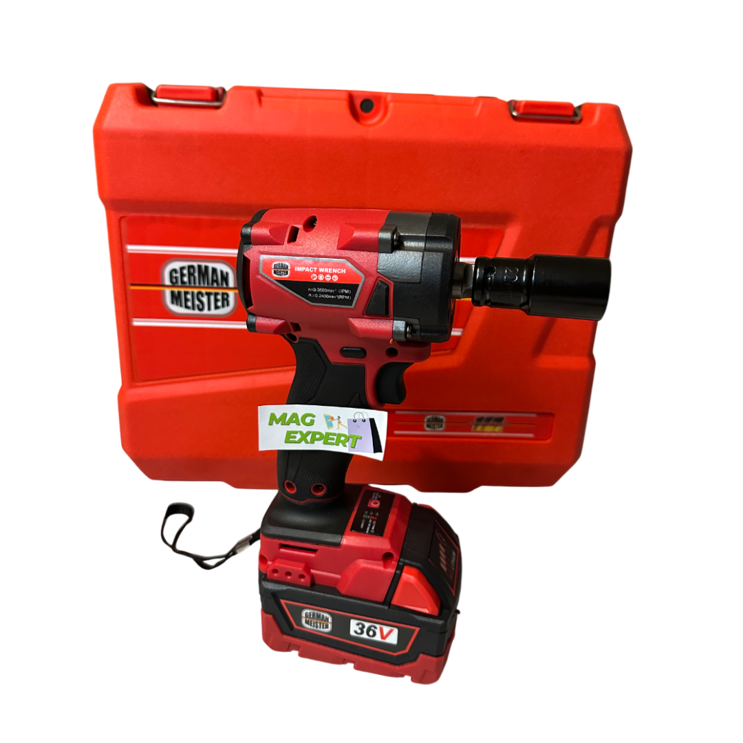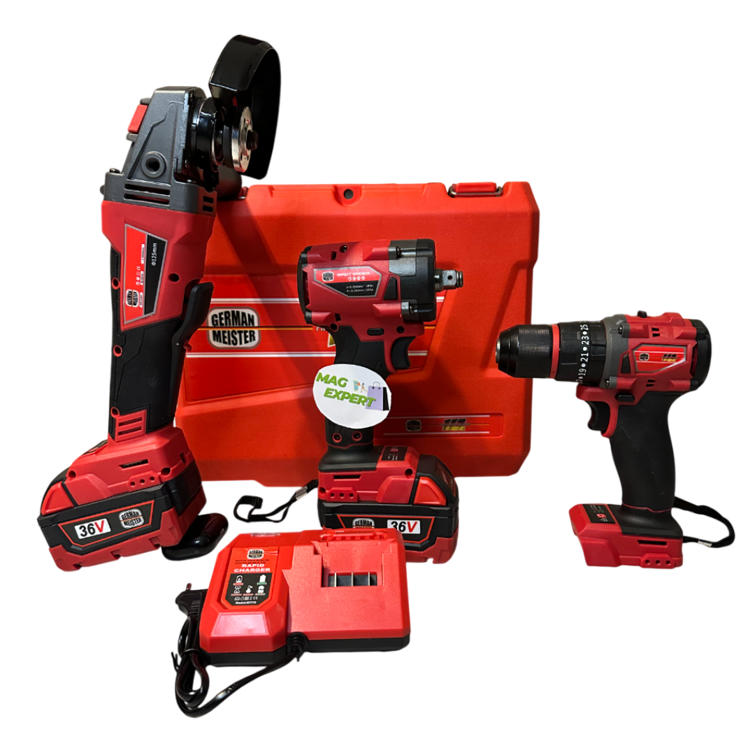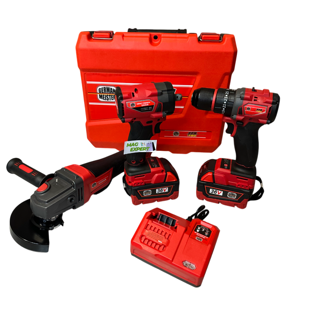 Set Scule cu 3 piese German Meister Brushless (fara perii) – Cheie cu Impact, Polizor Unghiular/Flex și Autofiletantă, 2 Acumulatori 36V 8 ah