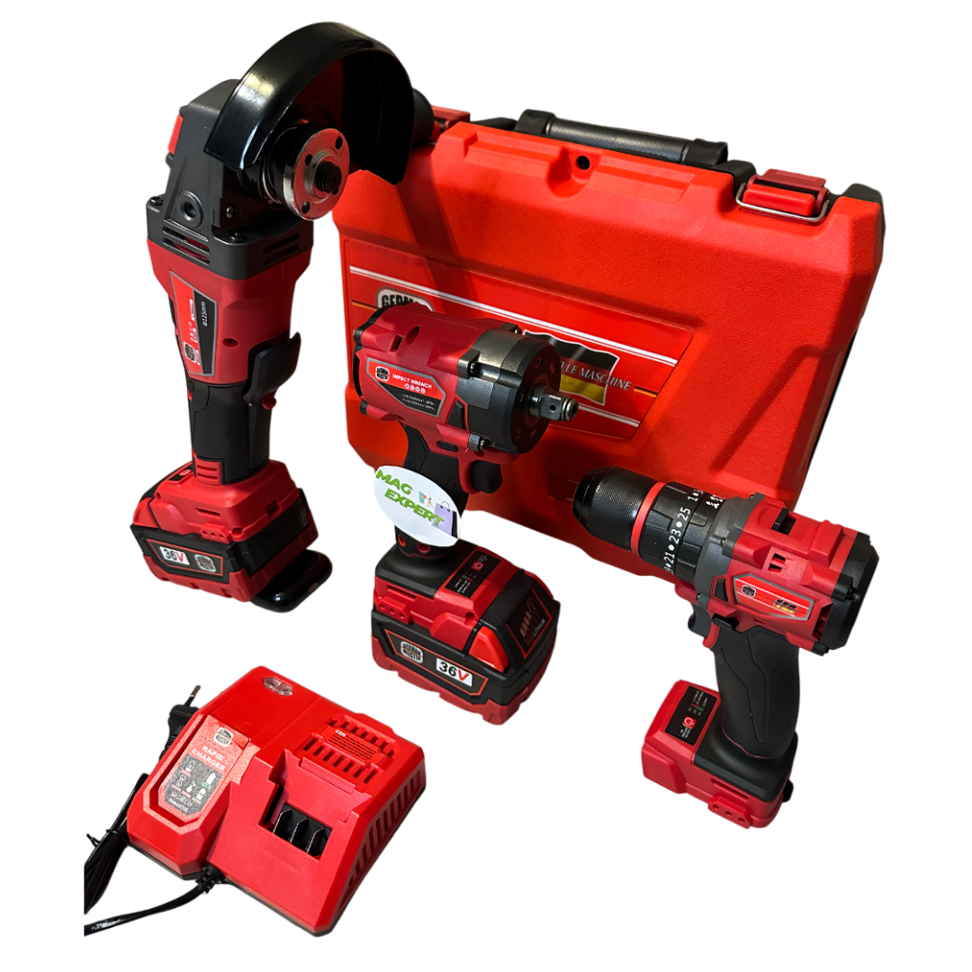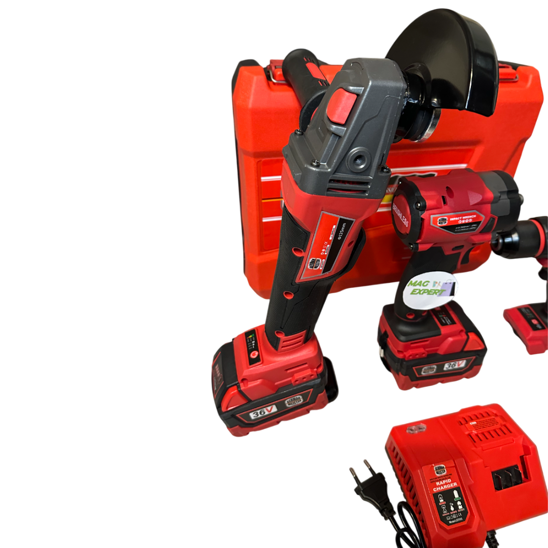 Set profesional complet, ideal pentru lucrări de construcții, service, montaj și bricolaj. Include 3 unelte Brushless de înaltă performanță, 2 acumulatori 36V de 5Ah, încărcător rapid și valiză de transport.