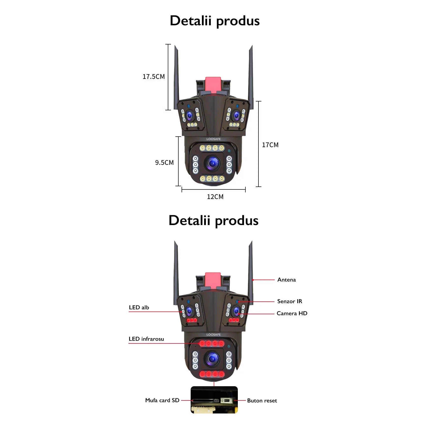 - Cameră triplă – 2 camere fixe + 1 cameră mobilă, pentru un unghi de vizualizare extins.
