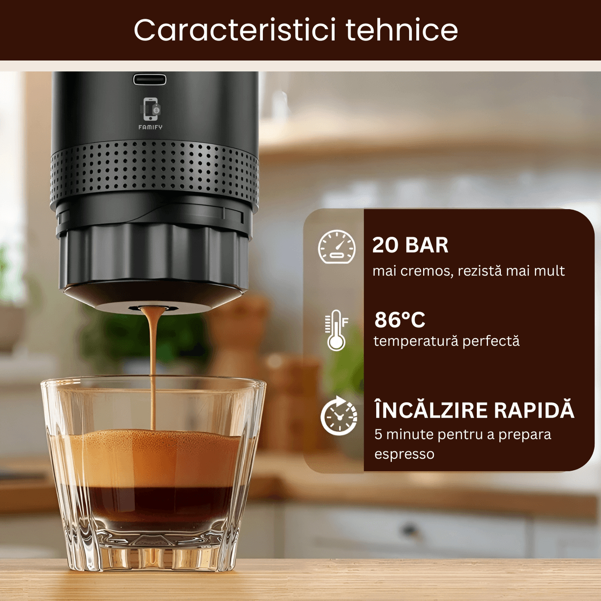 Bucură-te de un espresso autentic, oriunde te afli, cu espressorul portabil automat. Creat pentru cei cu un stil de viață activ, acest aparat compact îți oferă libertatea de a savura cafeaua preferată acasă, la birou, în mașină sau în aer liber.